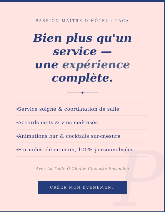 Chez Passion Maître d’Hôtel, nous vous offrons bien plus qu’un service en salle :