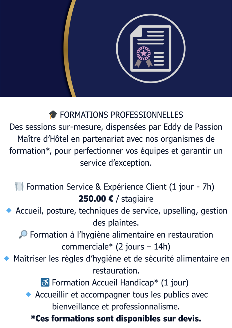 Afin d’assurer un service raffiné et une expérience inoubliable, je vous propose mes services de Maître d’Hôtel, avec des formules adaptées à votre événement