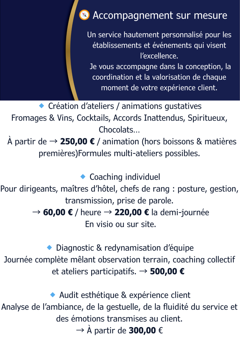 Afin d’assurer un service raffiné et une expérience inoubliable, je vous propose mes services de Maître d’Hôtel, avec des formules adaptées à votre événement