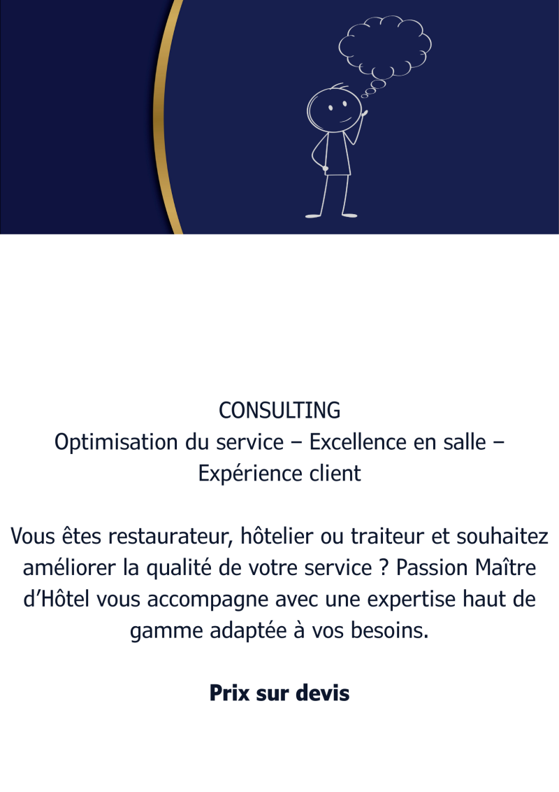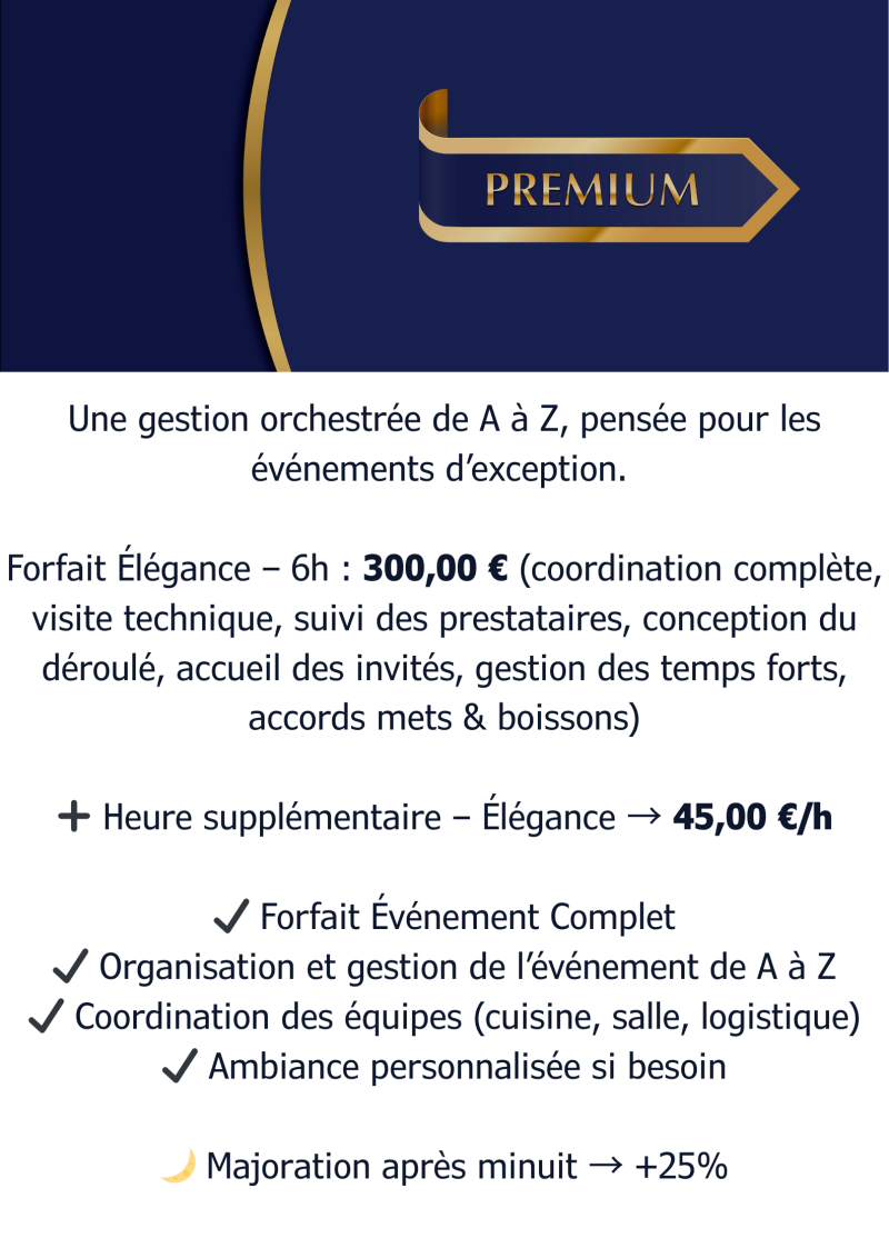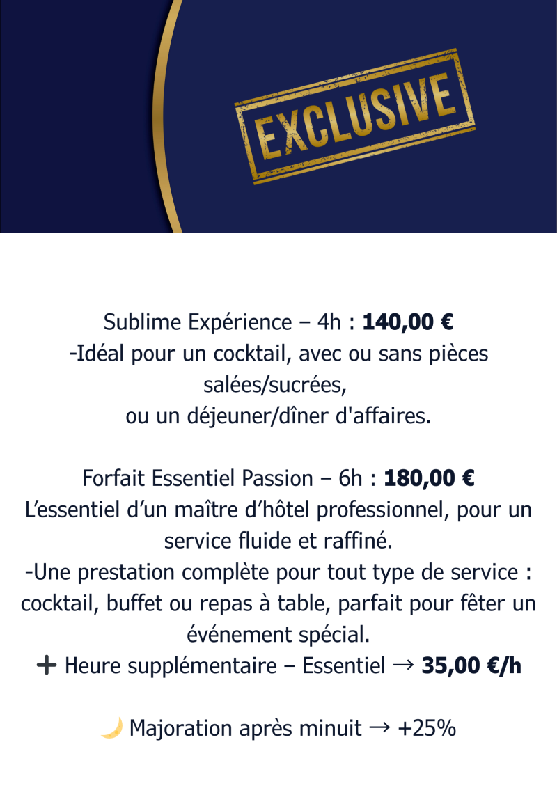 Afin d’assurer un service raffiné et une expérience inoubliable, je vous propose mes services de Maître d’Hôtel, avec des formules adaptées à votre événement